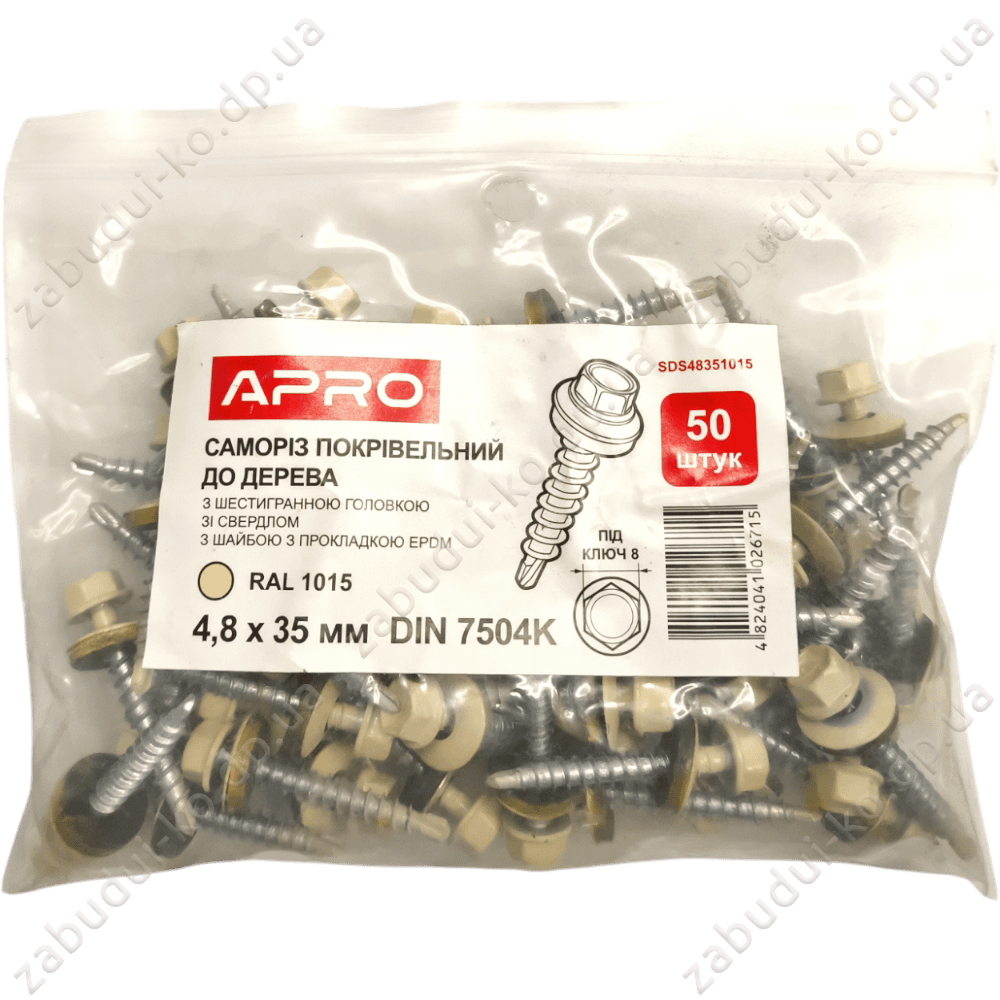Саморіз покрівельний до дерева з шайбою Apro 4,8х35мм RAL1015 (50шт)