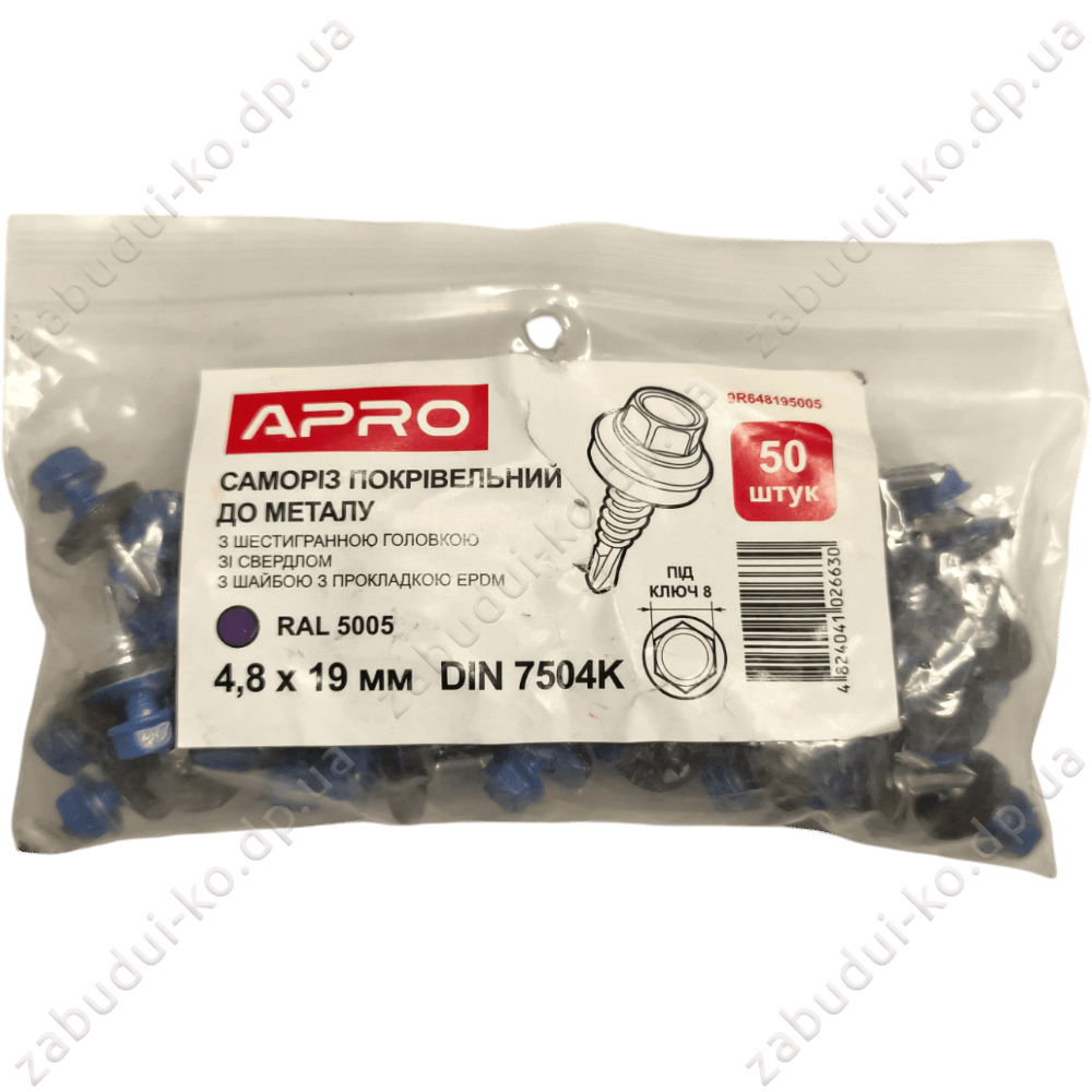 Саморіз покрівельний до металу з шайбою Apro 4,8х19мм RAL5005 (50шт)